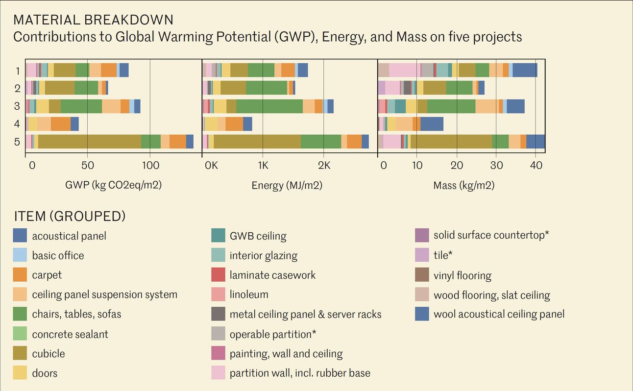 Carbon Leadership Forum created a graphic showing the contributions to global warming potential, energy, and mass on five projects: